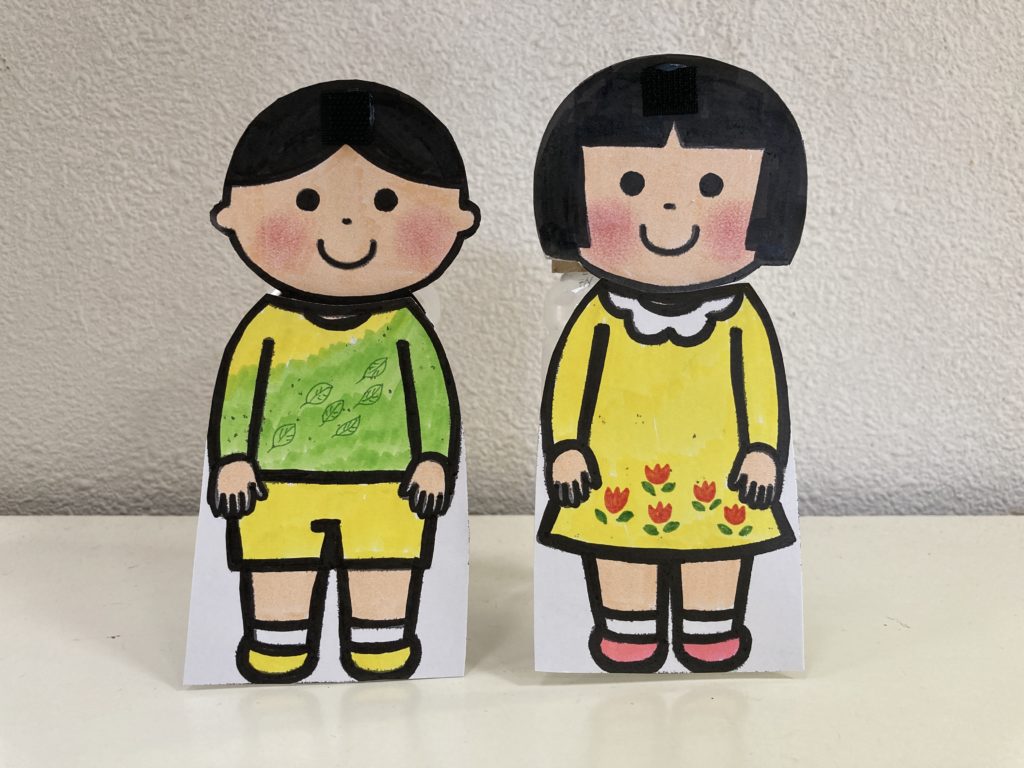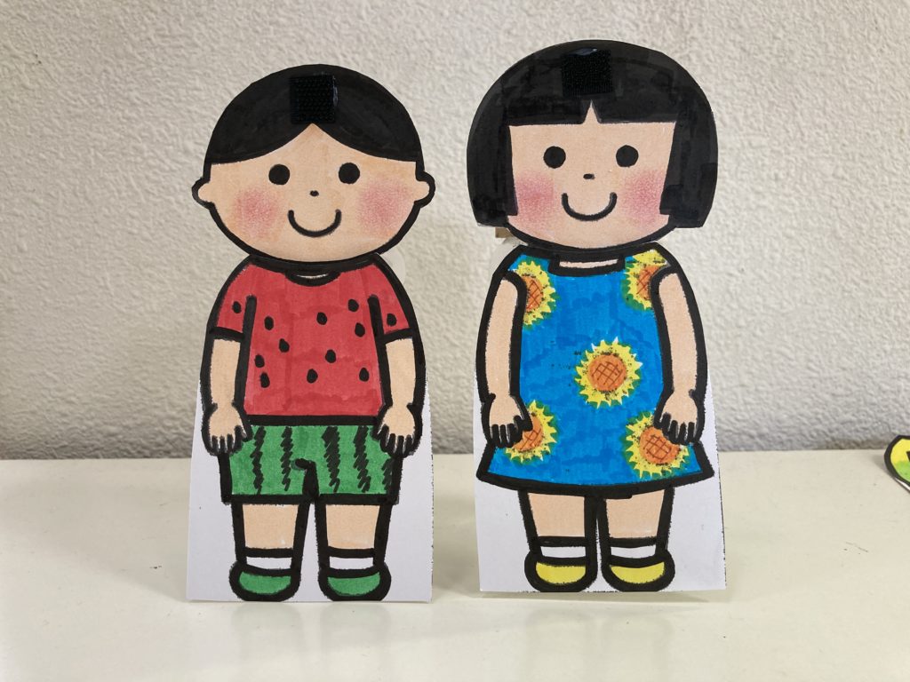 すてきな服を探しに来た、おーくんとひーちゃん。春の木漏れ日デザイン、夏を楽しむデザイン、くっつくとハートになるデザイン。どれもすてきなお洋服。