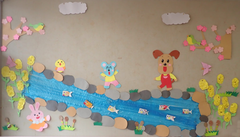春の小川に色んな魚いて、いろんなお花が咲いてるね